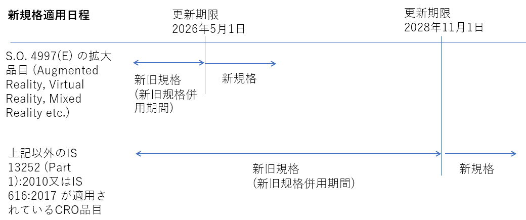 - 新たな申請については、更新期限まで(新旧规格併用期間中)は、新旧いずれの規格でも審査可能。ただし、旧規格の場合は並行適用期間終了までにIS/IEC 62368-1:2023へ移行する旨の宣言書が必要。