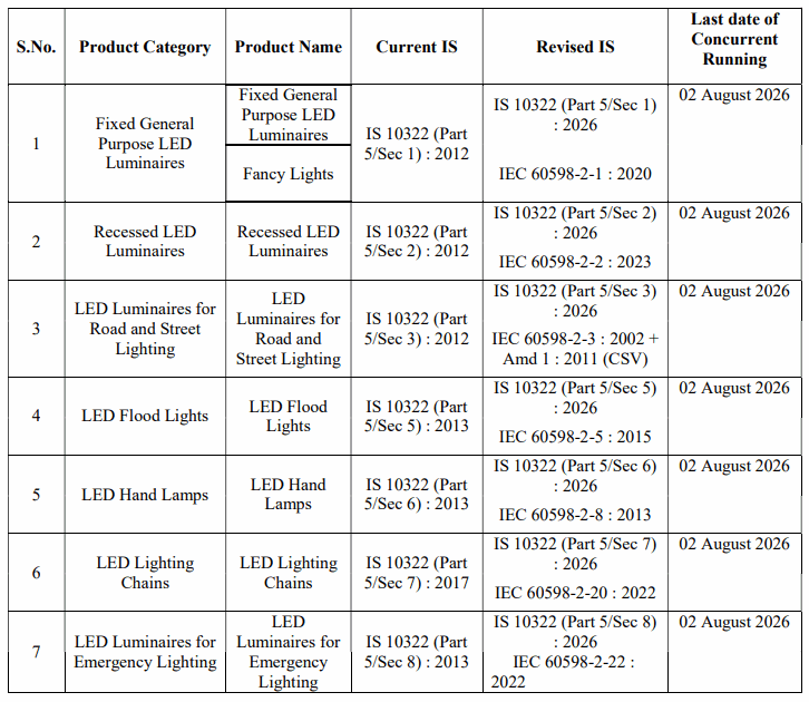 2026 年 8 月 2 日からLED照明器具のBIS適用規格がIS 10322(Part 1):2014 から IS 10322(Part 1):2026に改定されます(下表参照)。
